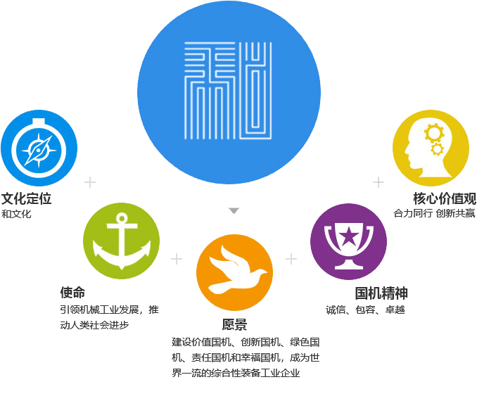 国机集团的企业文化体系建设以“和”文化为核心。这种“和”文化源于中国传统的价值观,体现了国机集团“合力同行、创新共赢”的核心价值,是对推动国机集团近年快速发展的先进文化价值的提炼,也是国机集团努力营造和谐、积极、健康、向上的组织氛围,激发团队活力,提升协作效率,增强组织向心力、凝聚力、竞争力的需要。国机人以“引领机械工业前进方向,创新机械工业发展道路”为使命,以“机械工业的领跑者,社会价值的创造者”为愿景。这种“和”文化建设,具有鲜明的时代特征, 反映了国机集团贯彻科学发展观,致力于和谐企业、和谐社会建设的理想和不懈追求。
